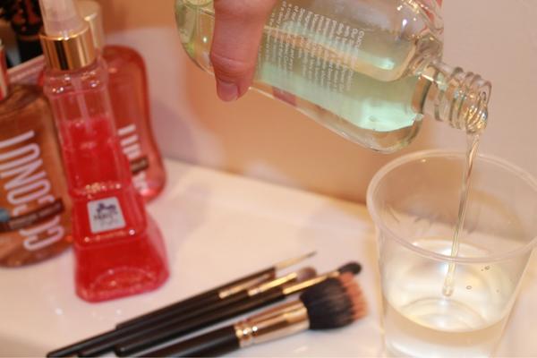 Limpiando las brochas de maquillaje. Paso 1 en un recipiente agrega agua y un poco de jabón liquido